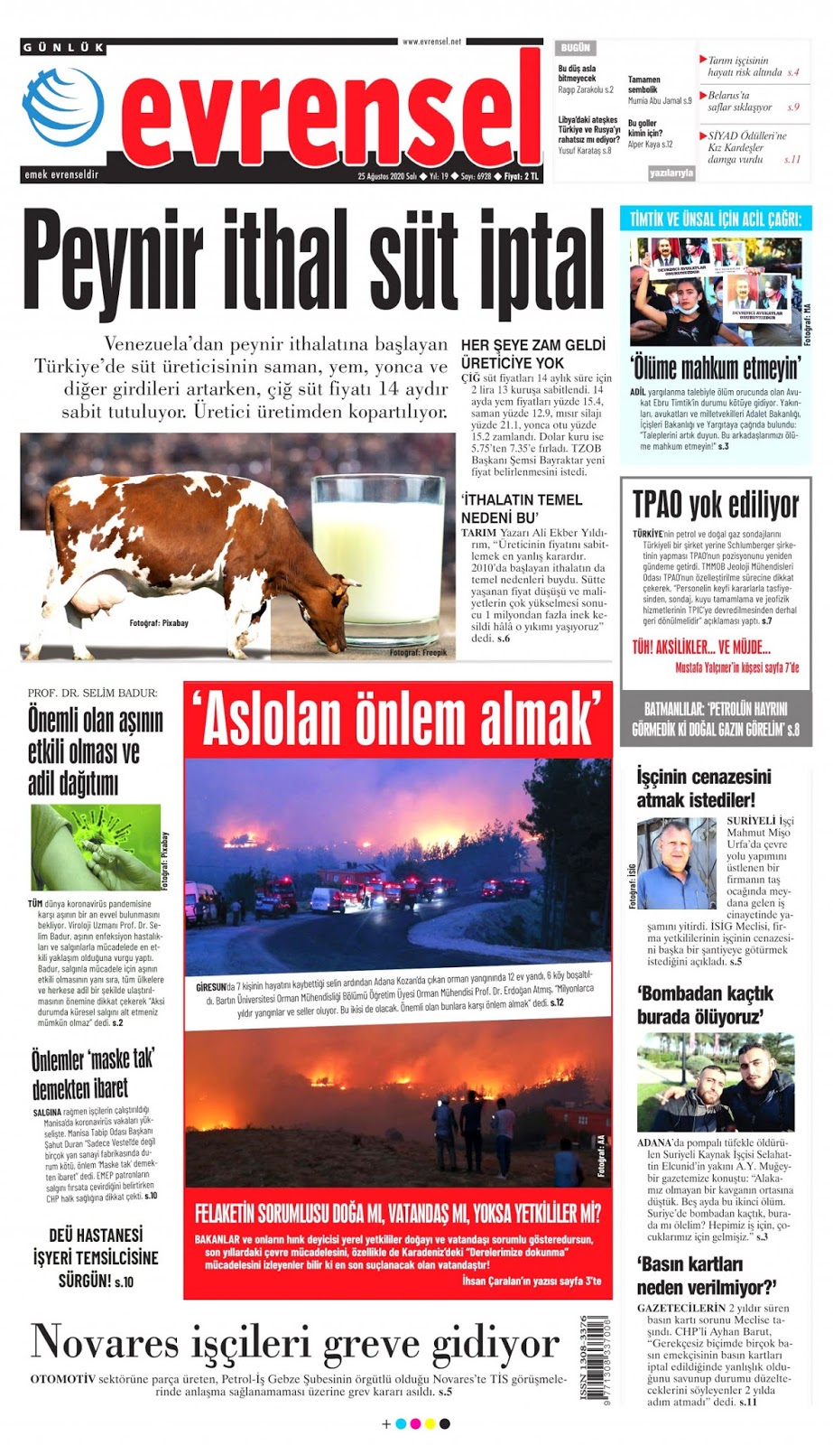 25 Ağustos 2020 Salı Gazete Manşetleri
