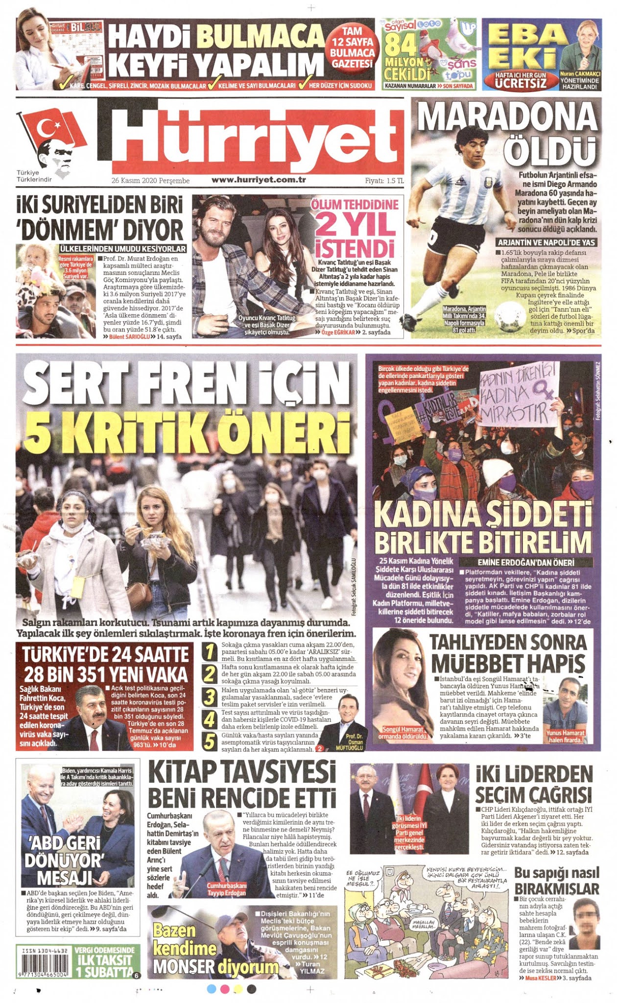 26 Kasım 2020 Perşembe. Türkiye'de yayımlanan gazete manşetleri.. Gazetelerin ilk sayfalarındaki haber başlıkları, (COVID-19) ilk kez ortaya çıktığı ve dünya ülkelerine yayılmaya başladığı andan itibaren, Türkiye'de de konu gazetelerin manşetlerinde yer bulmaya başladı. Koronavirüs haberlerine, Türkiye'de ilk (COVID-19) vakasının ortaya çıkmasıyla daha geniş yer bulmaya başlandı.