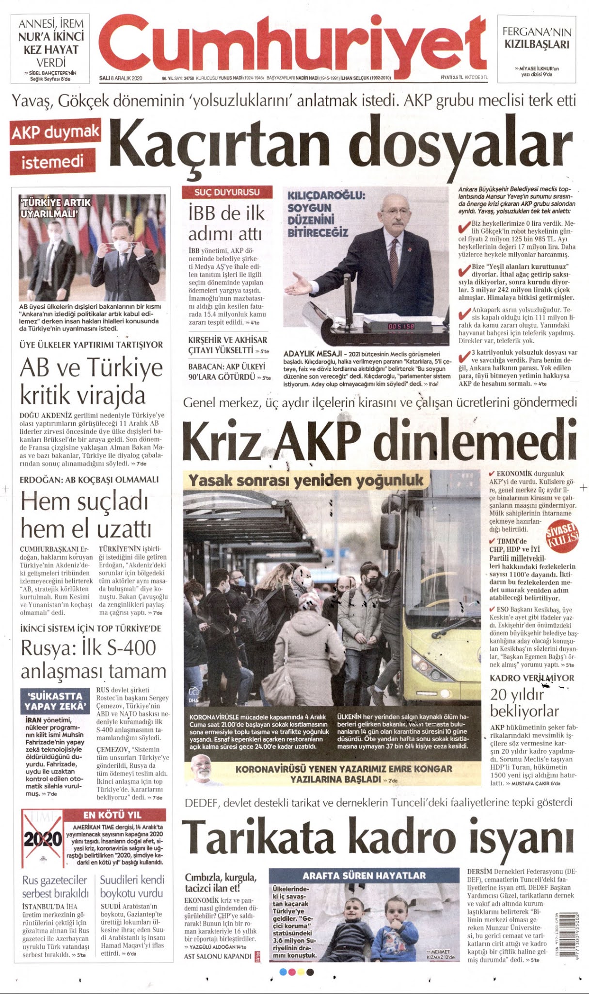 08 Aralık 2020 Salı. Türkiye'de yayımlanan gazete manşetleri.. Gazetelerin ilk sayfalarındaki haber başlıkları, (COVID-19) ilk kez ortaya çıktığı ve dünya ülkelerine yayılmaya başladığı andan itibaren, Türkiye'de de konu gazetelerin manşetlerinde yer bulmaya başladı. Koronavirüs haberlerine, Türkiye'de ilk (COVID-19) vakasının ortaya çıkmasıyla daha geniş yer bulmaya başlandı.